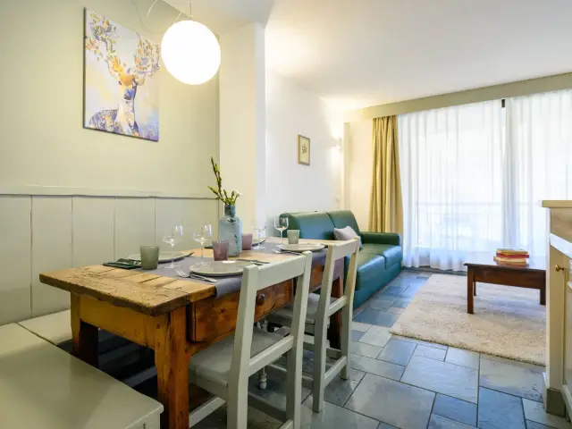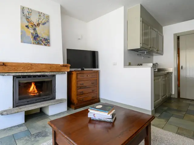 Gli spazi sono così suddivisi: ingresso, soggiorno con camino ed angolo cottura attrezzato; zona notte con camera matrimoniale, e cameretta con letto singolo, più una parete zona notte con letto a castello su misura. Doppi servizi.