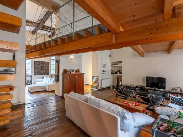 Dalla scala si accede al piano soppalcato dove troviamo una grande sala adibita a studio, un bagno con vasca e una cabina armadio, una camera da letto con bagno in camera e relativa cabina armadio/ripostiglio e un appendice utilizzato come studio.