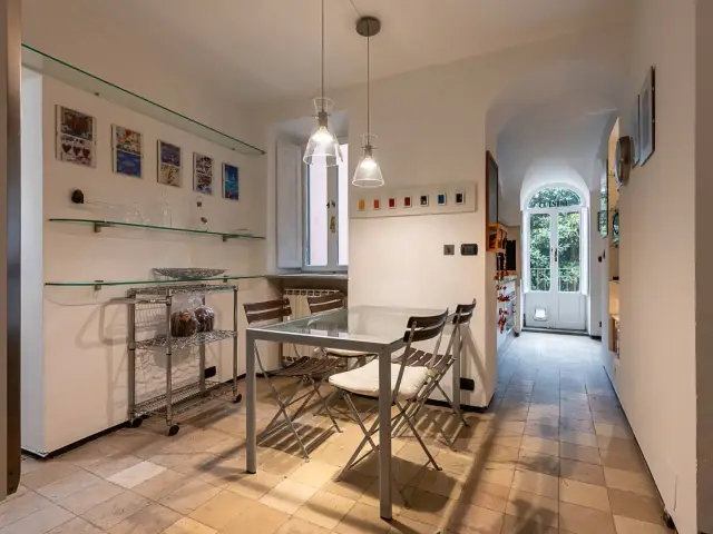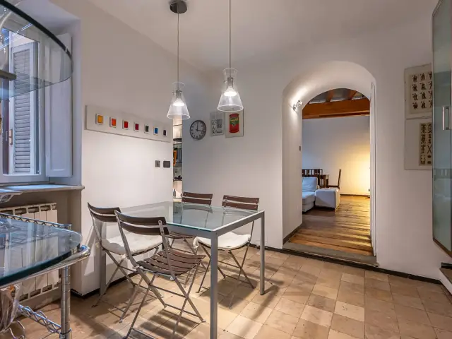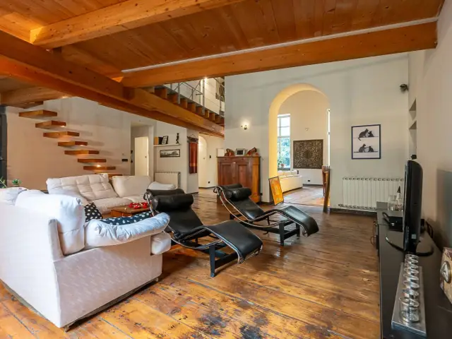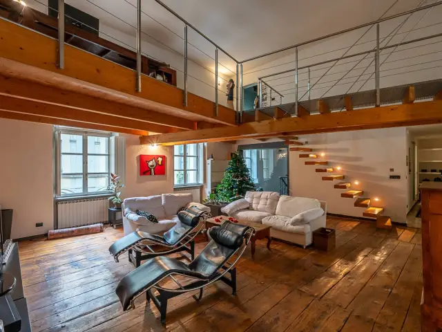 L'entrata del nostro appartamento è in comune con un altro alloggio, due rampe di scale conducono al piano primo. Arrivati al pianerottolo vi è il portoncino blindato che conduce in un open space davvero unico: due grandissimi saloni, di cui uno con camino e sala da pranzo con affaccio sul cortile del palazzo adiacente. E' presente un terrazzino utilizzabile per cene/pranzi nella bella stagione.