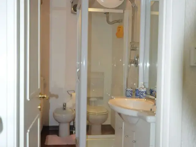 La zona cucina è stata creata in una zona del soggiorno, chiusa dalle porte scorrevoli, è dotata di 2 fuochi, frigo e fornetto microonde. Il bagno è di nuova fattura con doccia, la camera ha una finestra che da sul giardino e un armadio molto capiente, il soggiorno affaccia sul giardino privato dell'appartamento a cui si accede da una scaletta, da cui si gode di un'ottima vista e di una buona tranquillità. Avendo questo affaccio sul giardino l'appartamento è molto luminoso, anche nei periodi invernali e di grande utilità in estate durante le belle giornate dove normalmente si preferisce stare fuori. Il pavimento dell'appartamento è in legno. Il riscaldamento e centralizzato con le elettrovalvole mentre l'acqua calda è autonoma. Inoltre è compreso anche un Box auto.