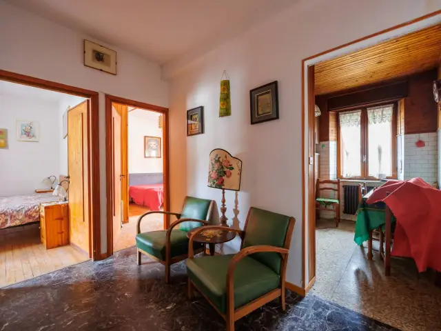 L'appartamento più grande è composto da: ingresso , cucina abitabile con uscita sul balcone, soggiorno con camino, due camere da letto matrimoniali e bagno.