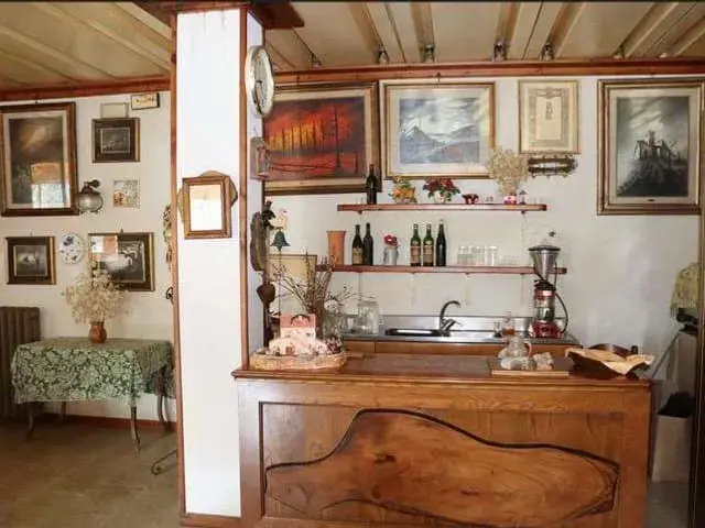 Dalla sala si accede a suggestivo porticato con tettoia e parapetti in legno che affaccia sul bosco circostante mentre, dal corridoio che porta alla cucina vi è l'accesso diretto ai terreni compresi nell'offerta.