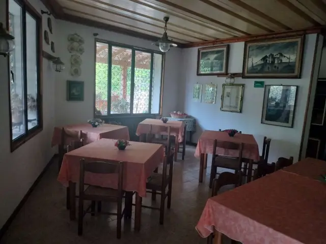 Il primo piano è raggiungibile sia dalla scala interna al ristorante che da vialetto laterale alla scala esterna. Percorrendo questo vialetto, infatti, si giunge ad un suggestivo porticato e alla immensa e panoramica terrazza che corre per buona parte del piano affacciandosi sui terreni di proprietà e sul torrente che li costeggia, del quale si può ascoltare il suono rilassante.