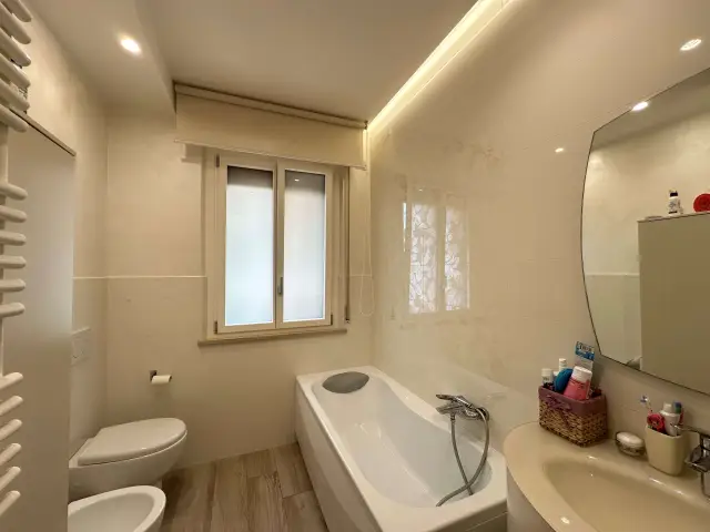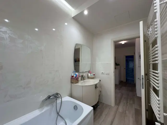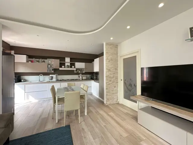 L'appartamento, situato al piano rialzato, si sviluppa interamente su un unico livello. L'ingresso si apre su un ampio soggiorno luminoso, caratterizzato da più finestre e da una cucina a vista. La zona giorno ha accesso diretto a due balconi. La zona notte comprende due camere da letto, uno studio (utilizzabile anche come terza camera) e doppi servizi.