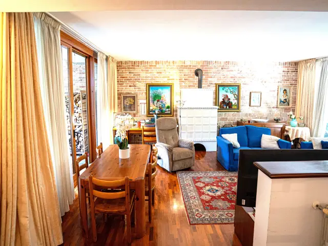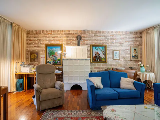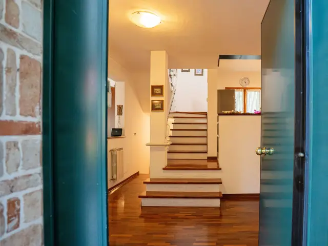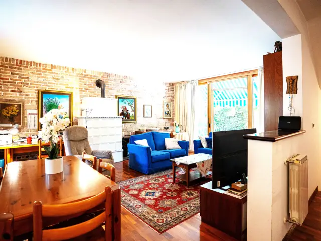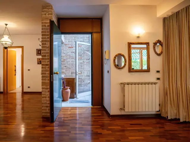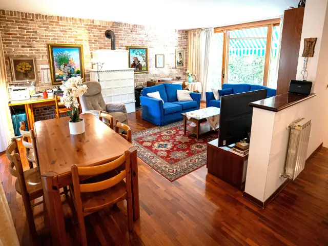 La villetta si sviluppa su due piani principali: al piano terra un ampio open space esclusivo e luminosissimo, grazie a due grandi vetrate che regalano uno scorcio del giardino riservato e una magnifica stufa in maiolica che rende l'ambiente accogliente e raffinato.