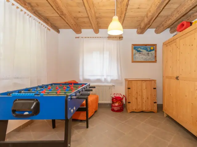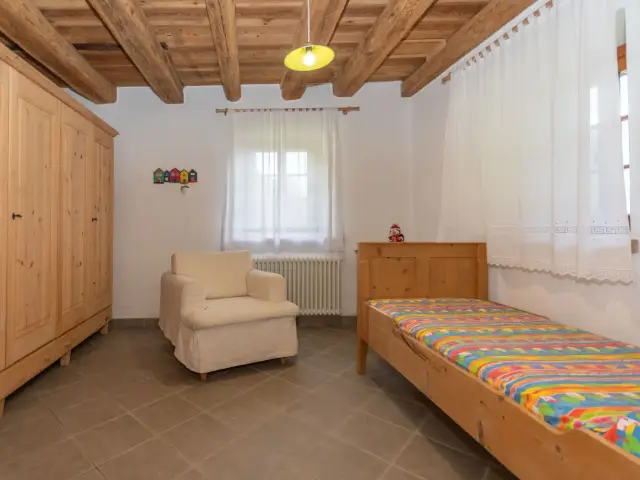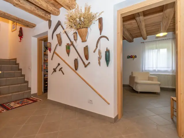 Salendo, il primo piano svela l’anima più autentica della casa: una cucina con zona pranzo che conserva il fascino dell’architettura originaria, impreziosita da una stufa a legna che scalda le serate più fresche. Il salotto, dominato dal tradizionale “fornel”, invita al relax con il suo tepore familiare. Il grande bagno con doccia e la camera matrimoniale completano questo livello, offrendo comfort e funzionalità.