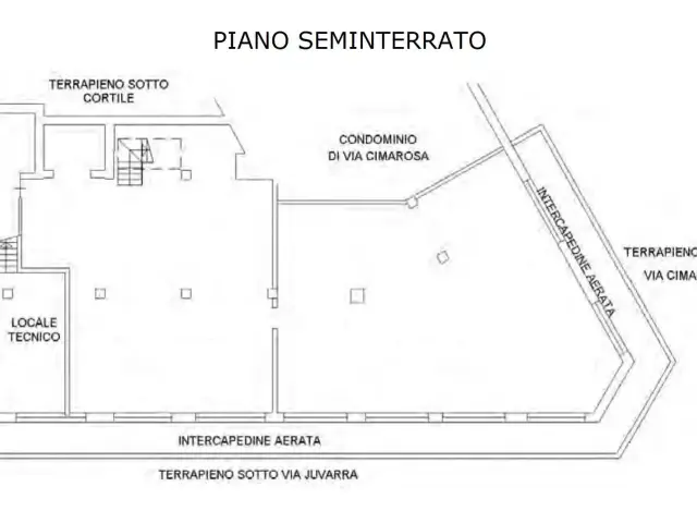 Percorrendo la scala interna raggiungiamo il piano seminterrato : un locale magazzino che si sviluppa su circa 273 mq. (C/2), dotato di scala che permette l'accesso anche dal cortile condominiale; predisposizione per montacarichi.