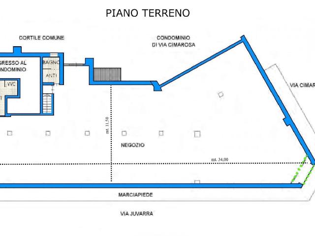 Il locale commerciale si sviluppa interamente al piano terra su circa 374 mq (C/1 - altezza mt. 4), affaccio su strada con ingresso principale angolare (apertura porta a sensori), 12 vetrine con serrande motorizzate, tre servizi, spogliatoio per dipendenti.