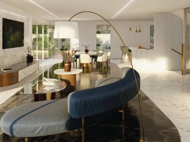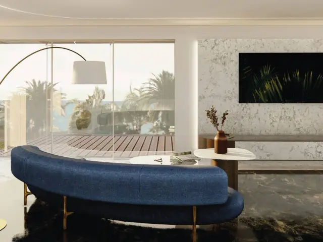 Al piano primo, l'appartamento si apre su un triplo soggiorno con cucina abitabile e bagno padronale con vasca, un grande studio e una palestra per mantenere uno stile di vita attivo, oltre a una camera da letto con vista sulla baia.