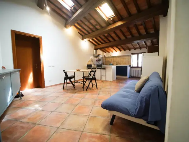 • Arredamento: L'immagine mostra un ambiente già parzialmente arredato, con un comodo divano letto e una zona pranzo.
