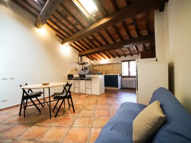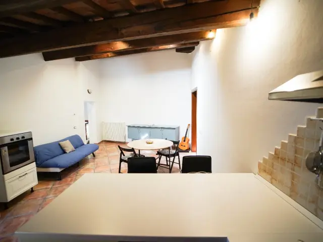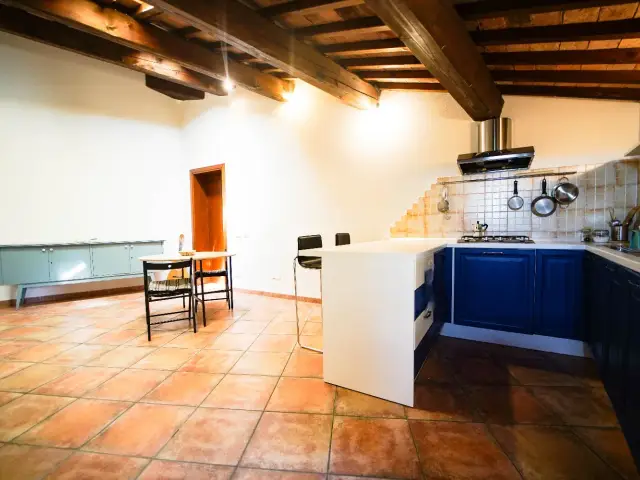 • Zona Giorno: Ampia zona living con cucina a vista, perfetta per momenti di relax e convivialità. Il soffitto con travi a vista conferisce un fascino rustico e accogliente, tipico delle abitazioni toscane.