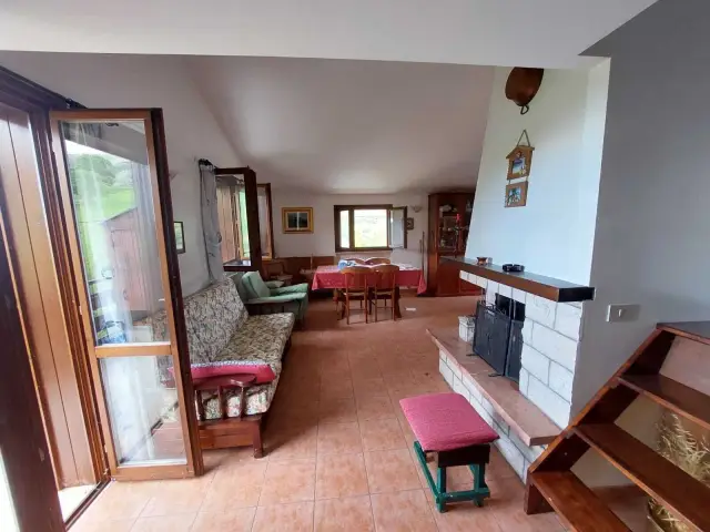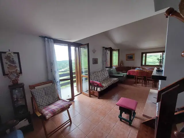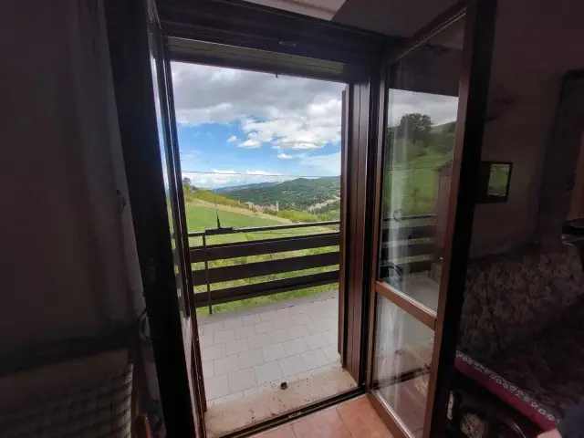 L’abitazione, di circa 85 mq e situata al secondo piano di una palazzina di due, si compone da ingresso su ampio soggiorno con camino funzionante, dotato di doppio affaccio sui monti, uno tramite portafinestra che conduce a spaziosa balconata con ringhiere e l’altro con finestra; proseguendo, dopo piccolo disimpegno troviamo comodo cucinotto a vista con finestra, grande bagno con vasca e finestra e, a terminare il piano, vasta e luminosa camera da letto fornita di altra panoramica balconata.
