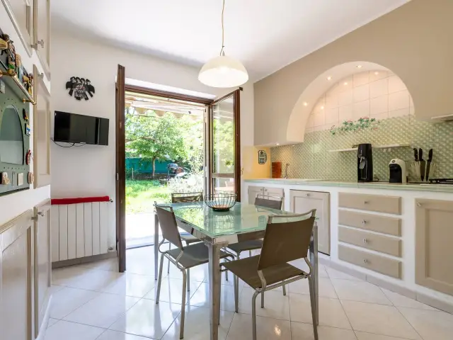 Al piano terra l'ingresso si apre su un luminoso e ampio soggiorno, cucina abitabile con affaccio diretto sul giardino ad uso esclusivo e un bagno dotato di doccia. Attraverso una comoda scala dotata di una particolare ringhiera in ferro battuto si accede al piano primo ove troviamo la zona notte con tre spaziose camere, bagno dotato di vasca e due comodi balconi, uno con affaccio sulla via e l'altro sul giardino privato. Salendo ancora dalla stessa scala si giunge al piano sottotetto formato da un grande open-space con due finestre che permettono la vista del centro paese.