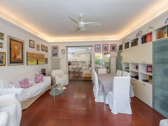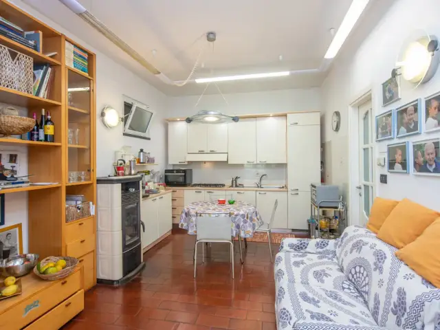Al piano terra si trovano un luminoso soggiorno, una cucina abitabile e un bagno, con accesso a un piacevole spazio esterno vivibile.