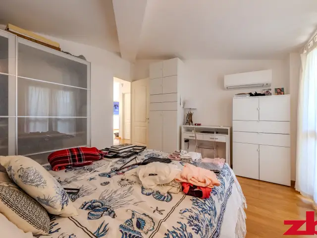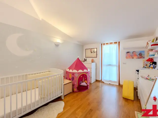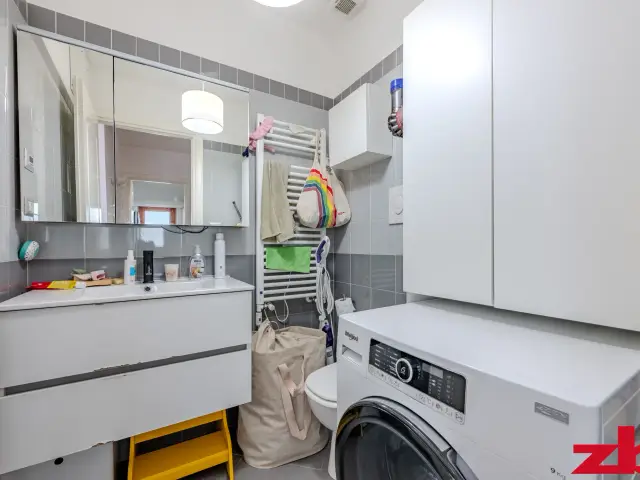 La zona notte si compone di due camere da letto, una matrimoniale e una media, che affacciano entrambe su un secondo terrazzo vivibile esposto a ovest, perfetto per godere della luce del pomeriggio. I bagni sono due: uno di servizio con angolo lavanderia e uno finestrato completo di doccia.