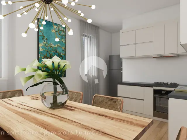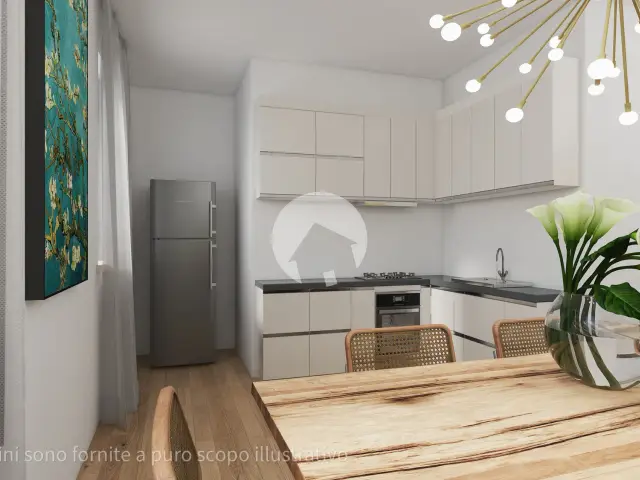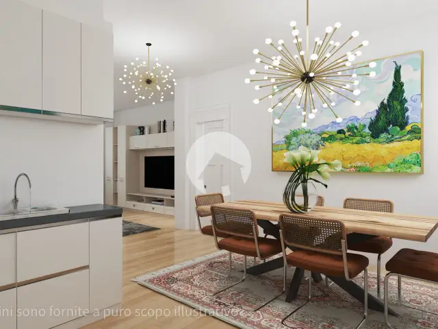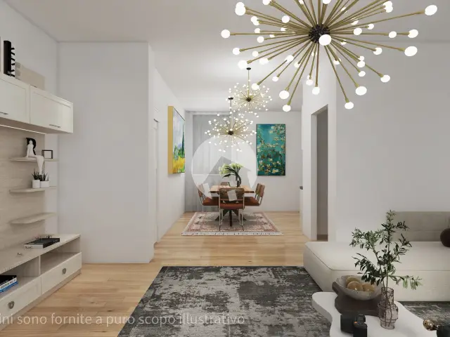 Composto da ingresso, soggiorno con cucina a vista (o con possibilità di renderla separata), tre camere da letto, e due bagni.