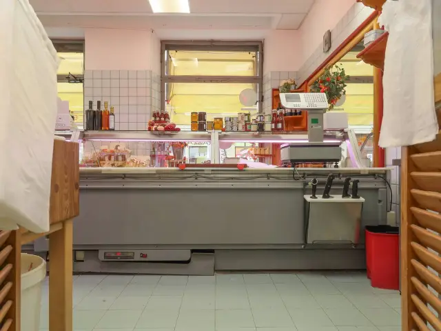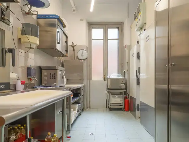 La disposizione dei locali è ben organizzata e funzionale, con un'area dedicata alla vendita e all'esposizione dei prodotti e un'altra riservata alla preparazione e lavorazione dei cibi.