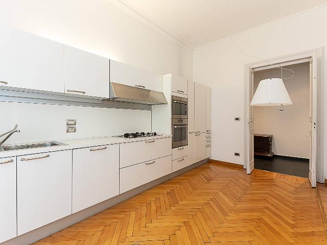 L'appartamento è posto al secondo piano ed è internamente composto da un ampio ingresso, un salone doppio dal quale si accede ad un'altra camera attualmente adibita a stanza da pranzo dotata di uno splendido camino d'epoca, una cucina abitabile, tre camere da letto (delle quali una dotata di un wc), due bagni, un comodo ripostiglio adibito a cabina armadi attrezzata, tre balconi di cui due con affaccio sul corso Palestro e l'altro sul cortile interno.