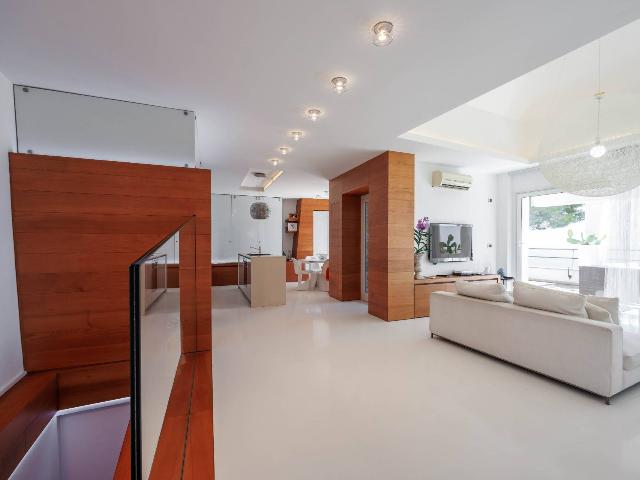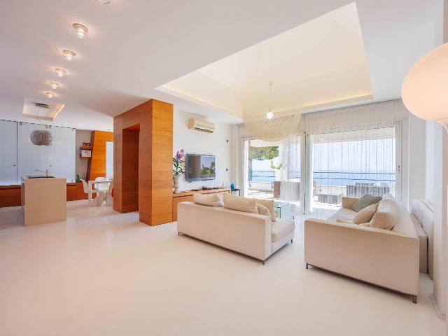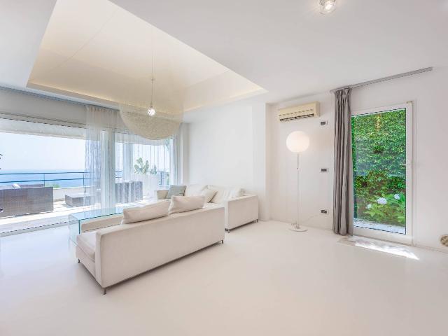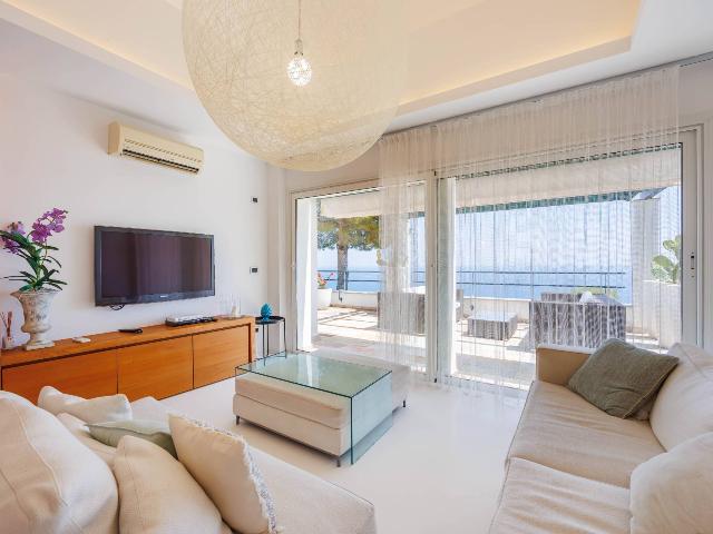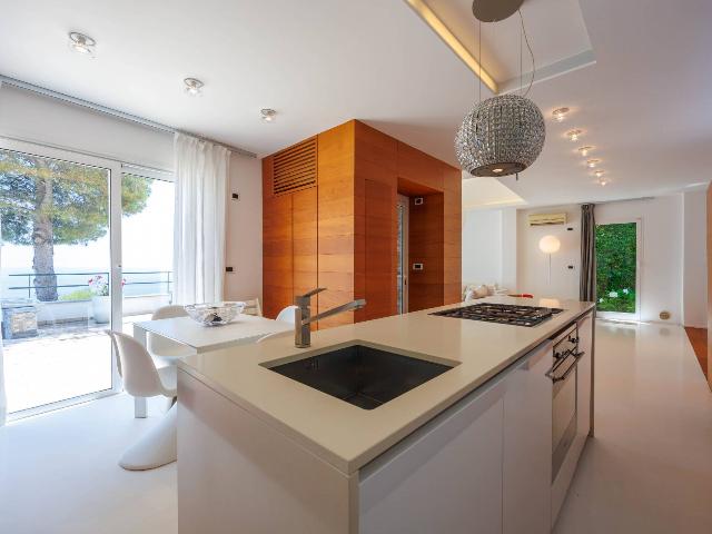 Rif. 1744 - In posizione dominante con vista totale e aperta sul mare, prestigiosa villa di recente costruzione disposta su due livelli con giardino privato, terrazzi, solarium, piscina con idromassaggio, grande autorimessa. L'unità ha il riscaldamento autonomo ed è libera su 4 lati. La villa è composta come segue: PIANO PRIMO: ingresso direttamente sul grande e luminoso salone con affaccio diretto sul giardino e sul mare, cucina a vista con zona pranzo, bagno e ripostiglio; PIANO TERRA: tre ampie camere da letto matrimoniali, bagno e ripostiglio. Alla villa è annessa un'ampia area esterna a fasce adibita a giardino, ampi terrazzi con zona relax, cucina esterna con BBQ, panoramica piscina privata con idromassaggio e box auto di circa mq 50. Finiture di alto livello con aria condizionata, arredi su misura, ampie vetrate in pvc con doppio vetro. La villa è rivestita in pietra locale, servizio di allarme con telecamere, impianto di irrigazione su tutto il parco. Un delicato equilibrio tra comfort e moderno, un quadro disegnato dal tramonto sul mare incorniciato dal verde dei pini marittimi rendono questa residenza unica nel suo genere.