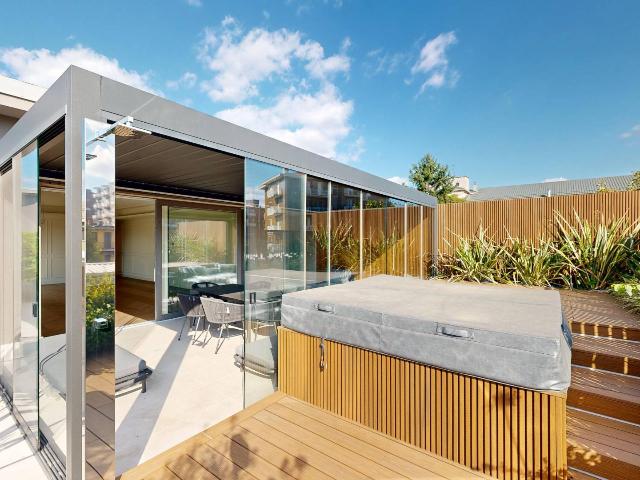 L'immobile si apre su un elegante ingresso che conduce all'ampio soggiorno, cuore della casa e cucina abitabile annessa. La zona giorno si affaccia su un magnifico terrazzo, attrezzato con una moderna veranda bioclimatica apribile, jacuzzi e barbecue, creando un'oasi di relax perfetta per intrattenere o godersi momenti privati.