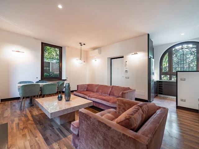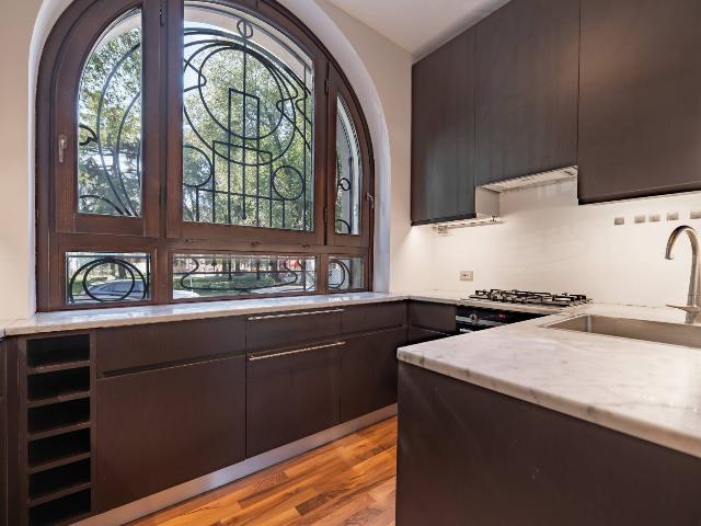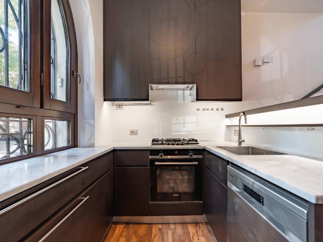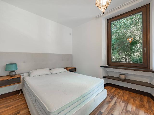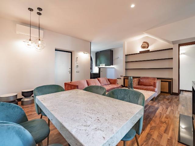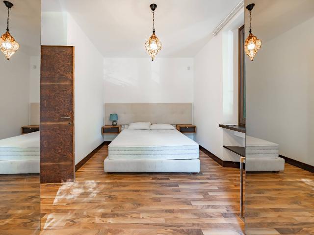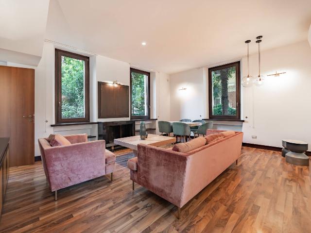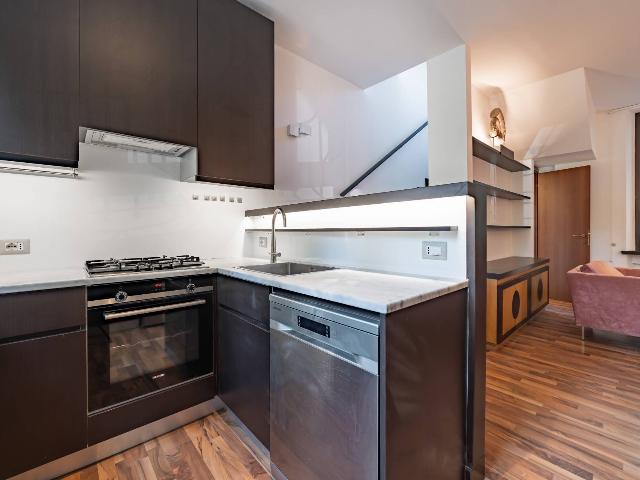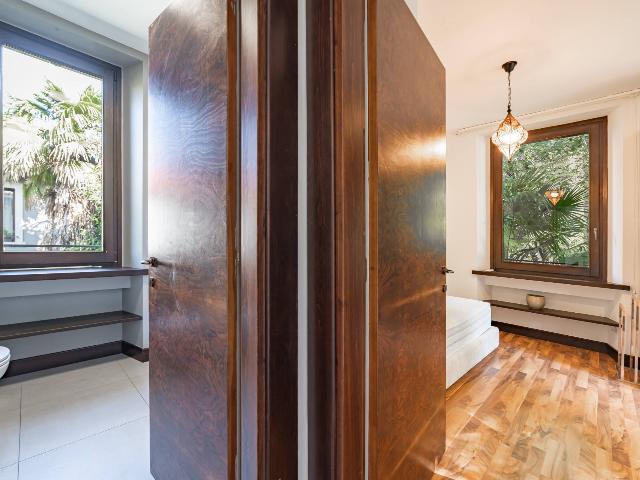La casa proposta, si sviluppa su tre piani ed è composta da ingresso al piano rialzato, ampio soggiorno con cucina all'americana e uscita sul giardino, al primo piano ci sono due camere di cui una con terrazzo e cabina armadio, servizio e mansarda, al piano seminterrato invece, una grande taverna con camino, zona armadi, lavanderia e servizio.