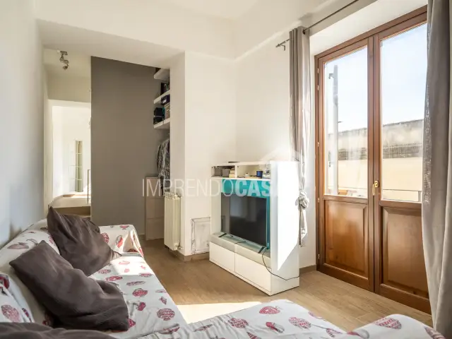 Composto da: Ingresso su zona giorno con angolo cottura, camera da letto, cameretta, servizio, armadio a muro, scala interna che porta ad una stanza da bagno finestrata con vasca e pavimentazione in ceramica a scacchi bianca e nera, 5 balconi!