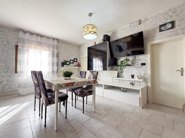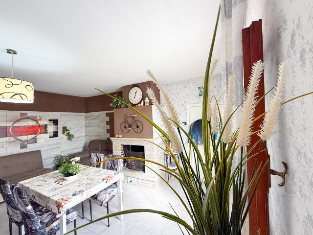 L’abitazione, disposta su due livelli, accoglie al piano terra una zona giorno, dove la cucina abitabile e il soggiorno convivono in un ambiente caldo e funzionale, a servizio del piano troviamo anche una cantina, un locale deposito e ripostigli