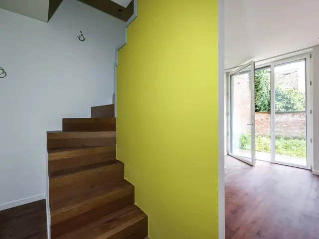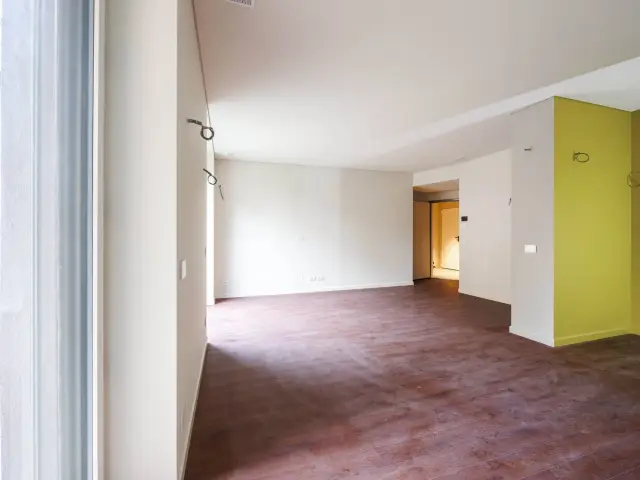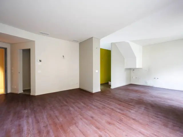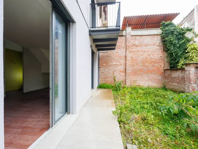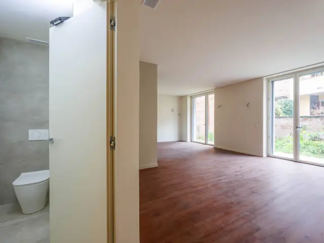 Piano terra: luminoso soggiorno con cucina a vista e affaccio sul giardino privato di 42 mq, bagno.