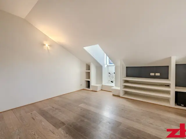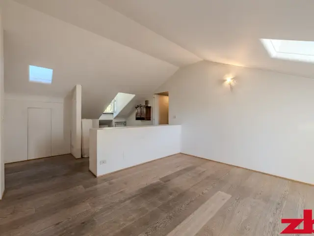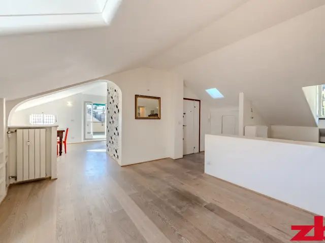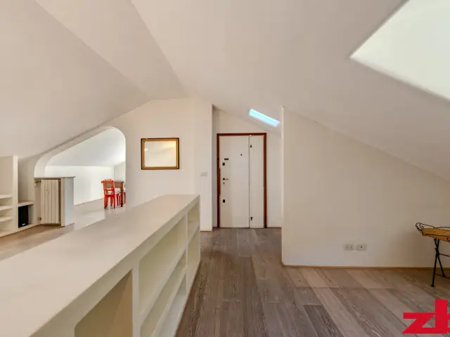 Essendo un attico mansardato, tutto il perimetro dell’appartamento è ottimamente sfruttato grazie a armadiature a muro su misura, pratiche e funzionali.