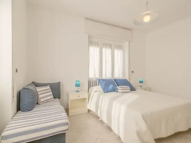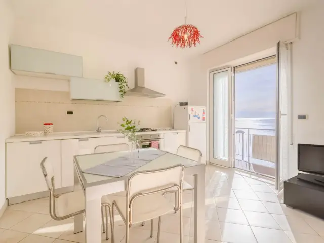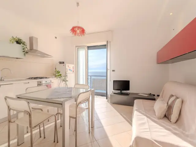 Gli interni offrono ambienti ben distribuiti e una luminosità piacevole, grazie all’esposizione che valorizza ogni vano. La zona giorno è un invito alla convivialità: soggiorno con angolo cottura e accesso diretto al balcone vista mare, perfetto per colazioni al sole, pause di relax e cene con il rumore delle onde in sottofondo. La zona notte comprende due camere matrimoniali, comode e accoglienti, pensate per ospitare famiglia e amici con la massima praticità. Completa la proprietà un bagno finestrato con doccia, funzionale e ben mantenuto.