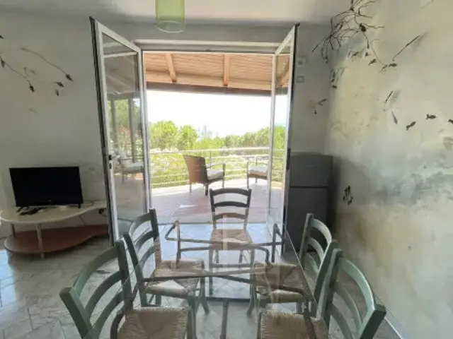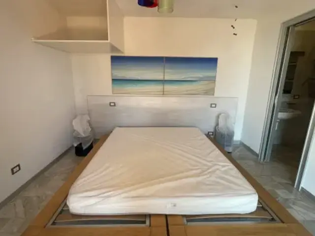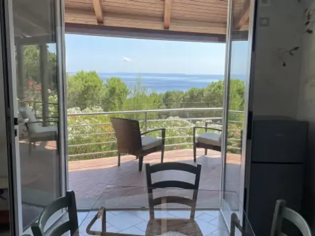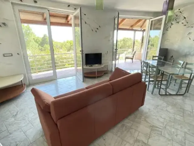 All’interno troviamo un ampio soggiorno con porte finestre che danno su una terrazza panoramica con vista mare con sdraio, sedie e tavolini, l’ambiente ideale per il relax e l’intrattenimento all’aperto.