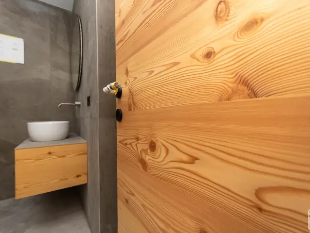 Particolare attenzione è stata dedicata ai materiali naturali, con pavimenti in larice naturale che donano calore e armonia agli ambienti, creando un’atmosfera elegante e accogliente.