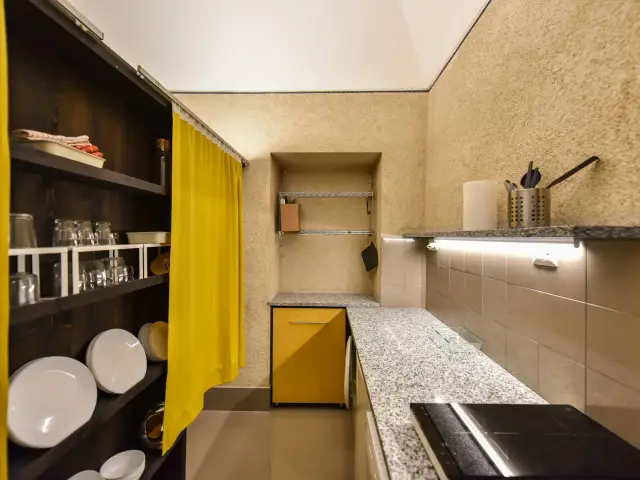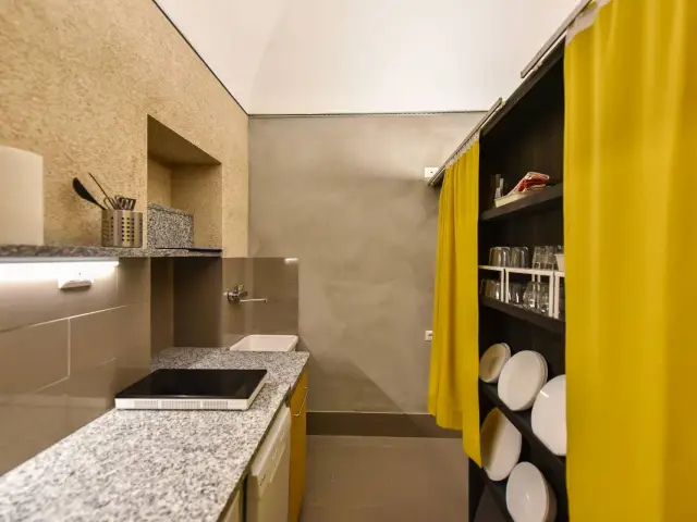 Al fondo della sala da pranzo, divisa da un elegante separé, la zona cucina con il piano cottura ad induzione e il lavandino, oltre a lavastoviglie e ampio piano di lavoro.