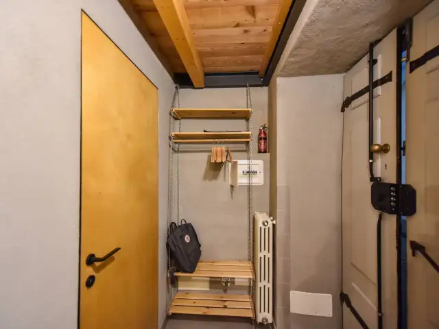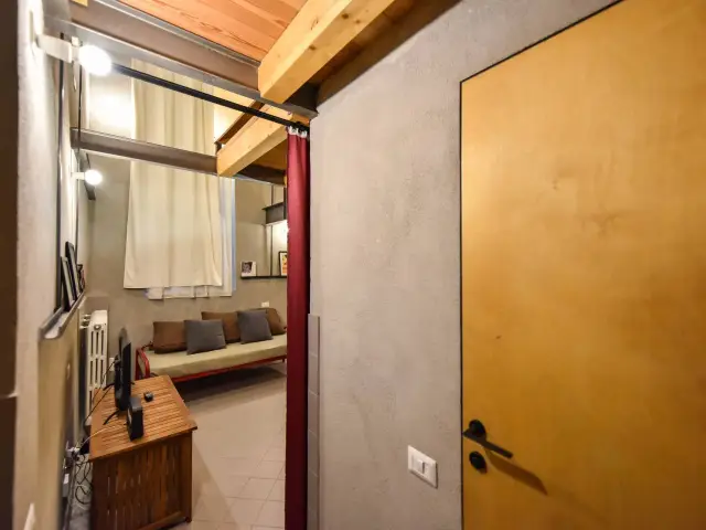 Di fronte all'ingresso è presente il bagno dell'appartamento con doccia. Il soggiorno è separato dall'ingresso dalla strada da una bussola.