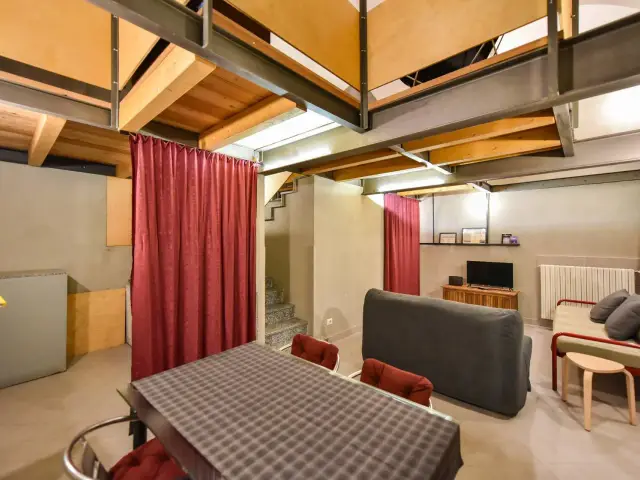 La scala porta al piano soppalco articolato secondo le altezze delle volte storiche in tre zone: due letti con attrezzatura guardaroba e comodino, zona relax con piano appoggio.