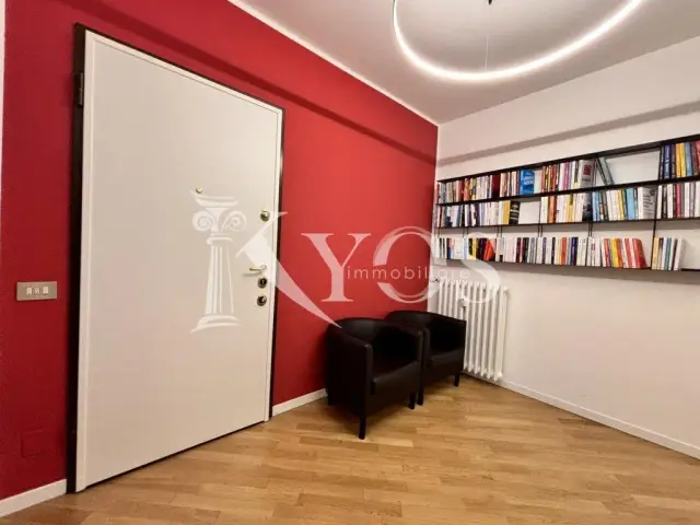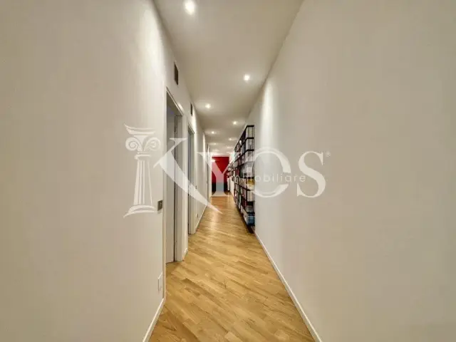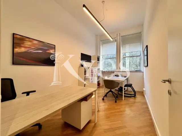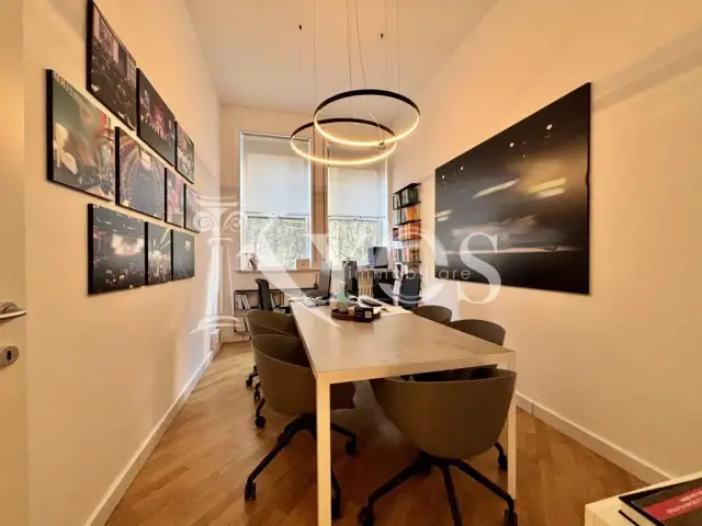 L’unità immobiliare rimane estremamente riservata grazie all’affaccio sul cortile interno, è composta da ingresso, sei locali, servizi e due pratiche cantine fruibili come deposito/archivio. L’attuale disposizione interna rende l’immobile particolarmente interessante per studi professionali associati.