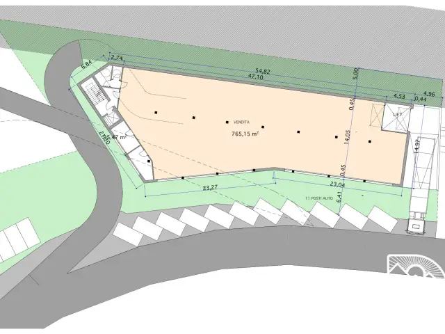 Le planimetrie disponibili offrono solo un esempio (800 mq. area vendita più locali accessori) delle potenzialità di edificazione, il progetto potrà essere ampliato o adattato per soddisfare esigenze specifiche.