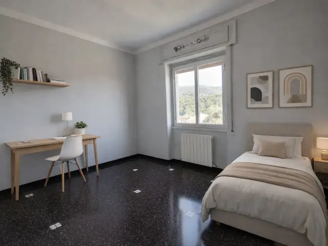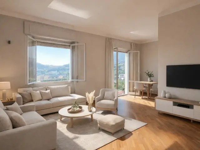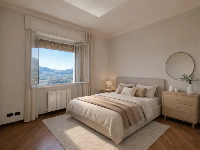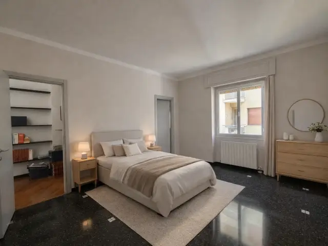 L'immobile, molto luminoso grazie all’esposizione sud-ovest, si compone di: ingresso in ampio soggiorno con cucinino collegato e ampio balcone, quattro camere da letto di cui una con cabina armadio, due bagni, lavanderia, armadiature a muro, piccolo spazio adibito a studiolo, secondo balcone accessibile da una delle camere.