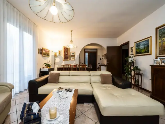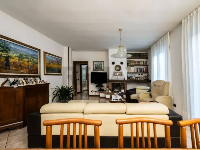 Entrando, si accede ad un luminoso soggiorno dotato di ampie finestre che offrono una piacevole vista sul giardino.