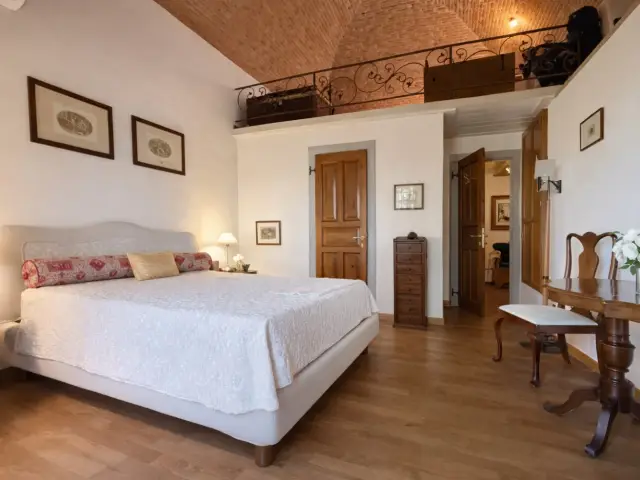 La proprietà si sviluppa su due livelli e coniuga il valore storico dell’architettura toscana con una distribuzione interna funzionale e ben equilibrata. Al piano terra si apre una zona giorno accogliente con camino originale restaurato, oltre a servizio e ripostiglio. Al piano superiore trovano spazio due camere, doppi servizi e uno studio su soppalco affacciato sulla camera matrimoniale, soluzione architettonica che valorizza volumetrie e luminosità.