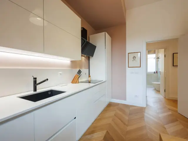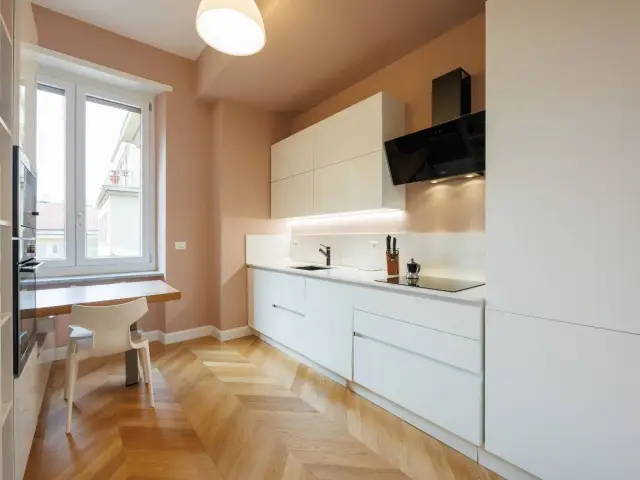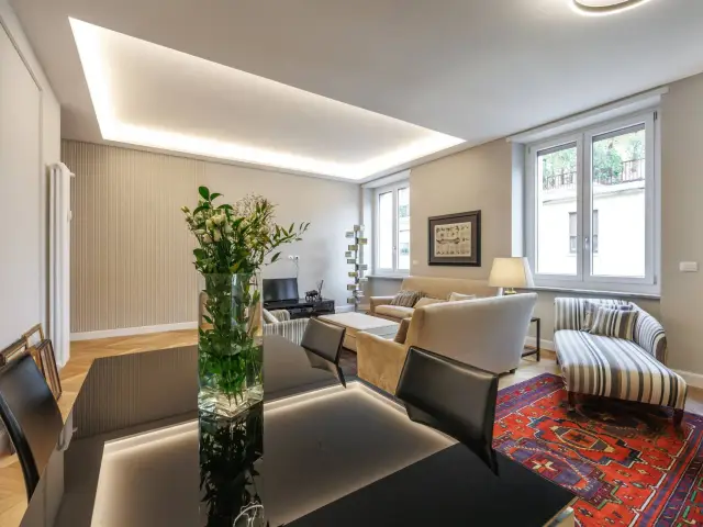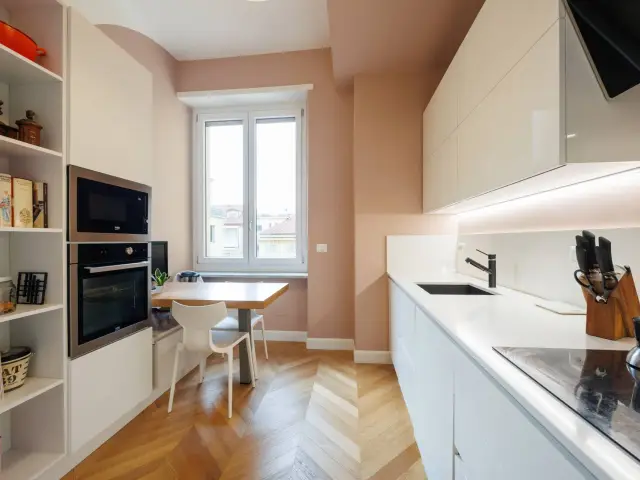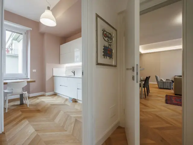 L'appartamento si distingue per la qualità della ristrutturazione, i colori ricercati delle pareti, l'illuminazione studiata e l'elegante parquet presente in tutti gli ambienti principali.