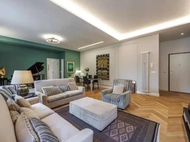 L'ingresso conduce a un ampio disimpegno che introduce alla splendida zona giorno, composta da un generoso soggiorno doppio con area living e zona pranzo. L'ambiente, impreziosito da grandi finestre e da un caldo parquet posato a spina di pesce, offre spazi ideali per ricevere e vivere la casa con comfort ed eleganza.