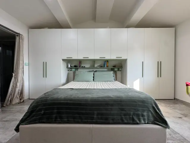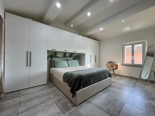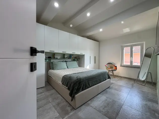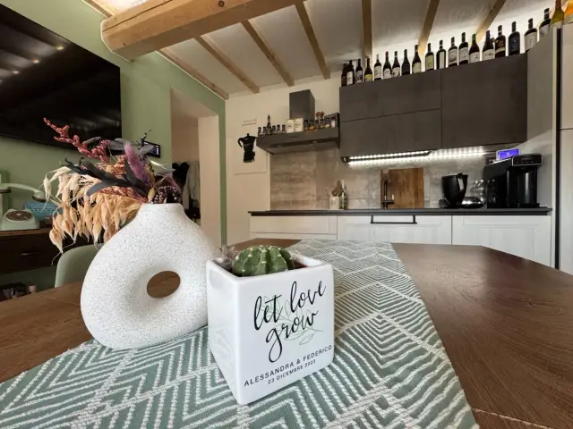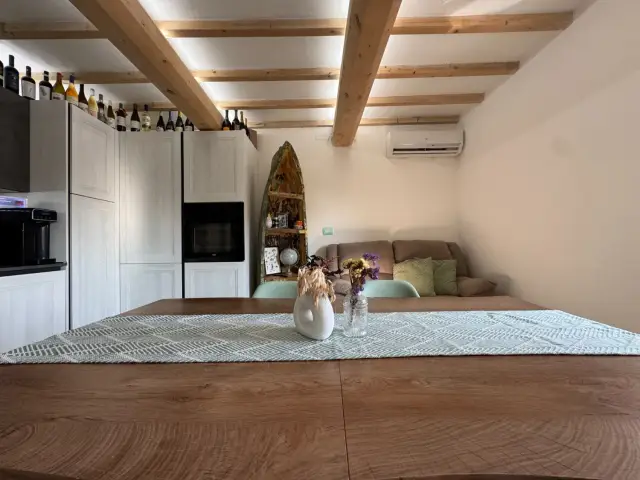 L’ingresso si apre al piano terra, dove una scala interna conduce alla zona giorno posta al primo piano. Qui si sviluppa l'open space con cucina a vista e soggiorno, caratterizzato da travi in legno a vista, pavimenti moderni in gres di grande formato e dettagli che uniscono stile contemporaneo e calore domestico. La distribuzione degli spazi è funzionale e accogliente, pensata per vivere al meglio la quotidianità.
